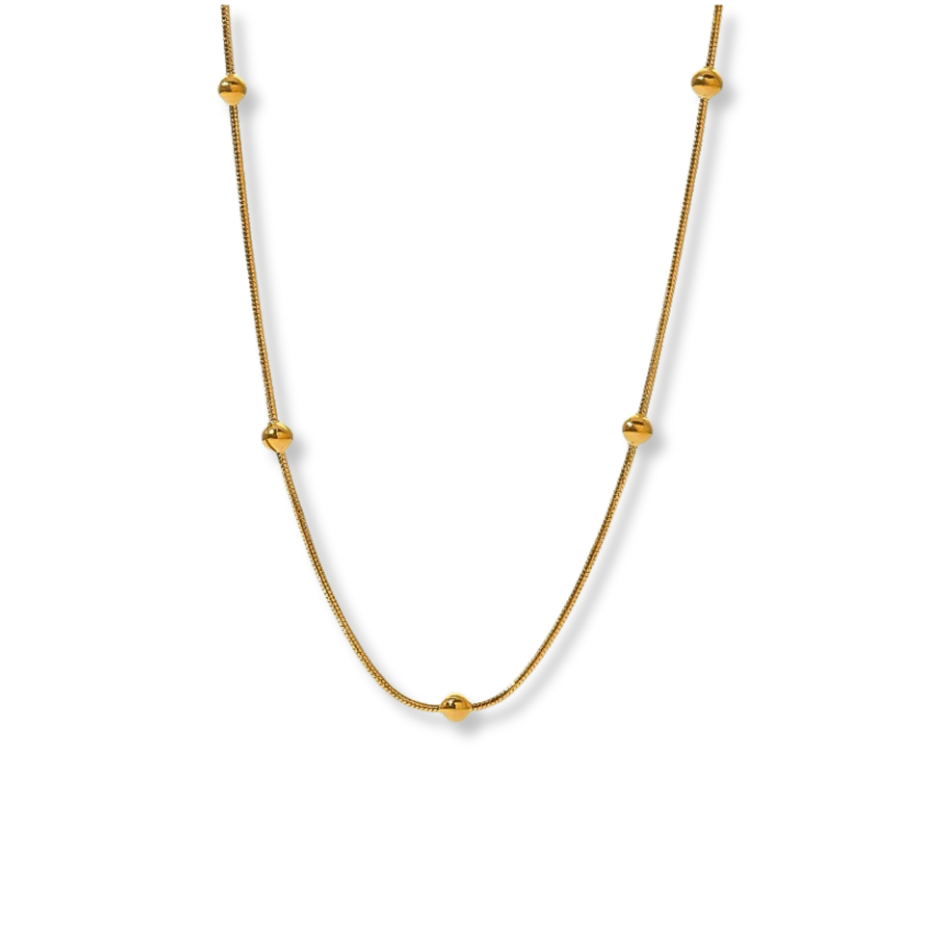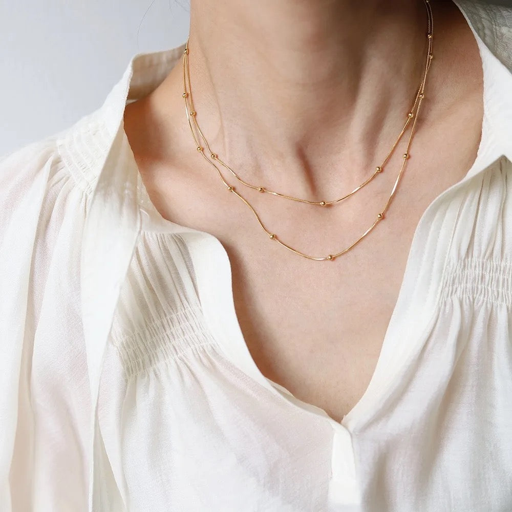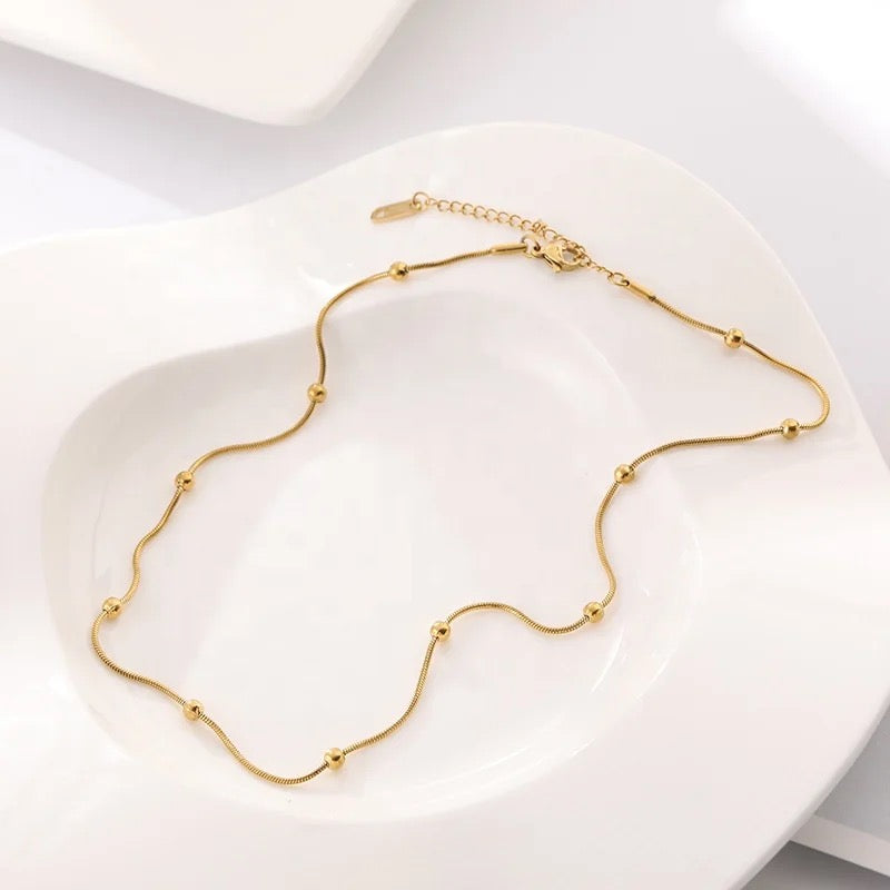 Accessorise with ease using this beaded snake chain. Its 18k gold plated stainless steel construction ensures durability and longevity, while its thin design allows for effortless layering. Plus, it's waterproof, tarnish free, and hypoallergenic, making it perfect for everyday wear.