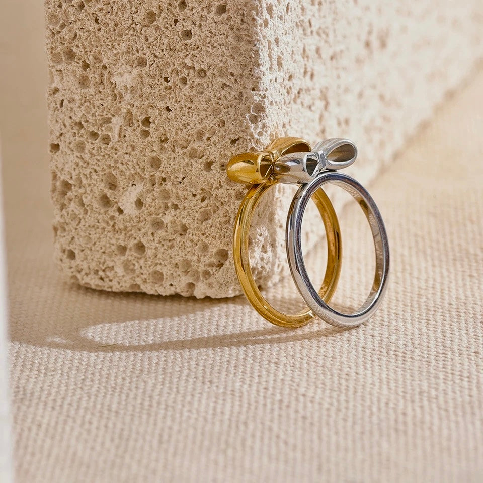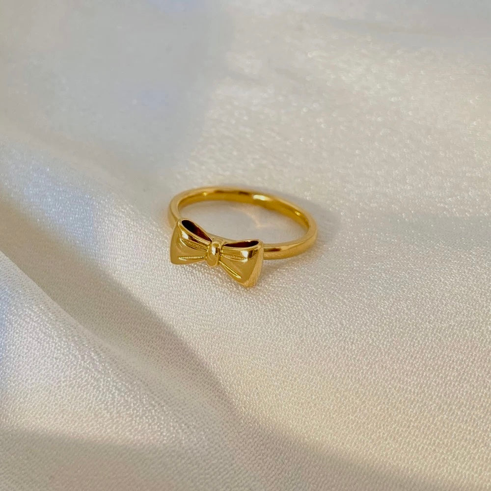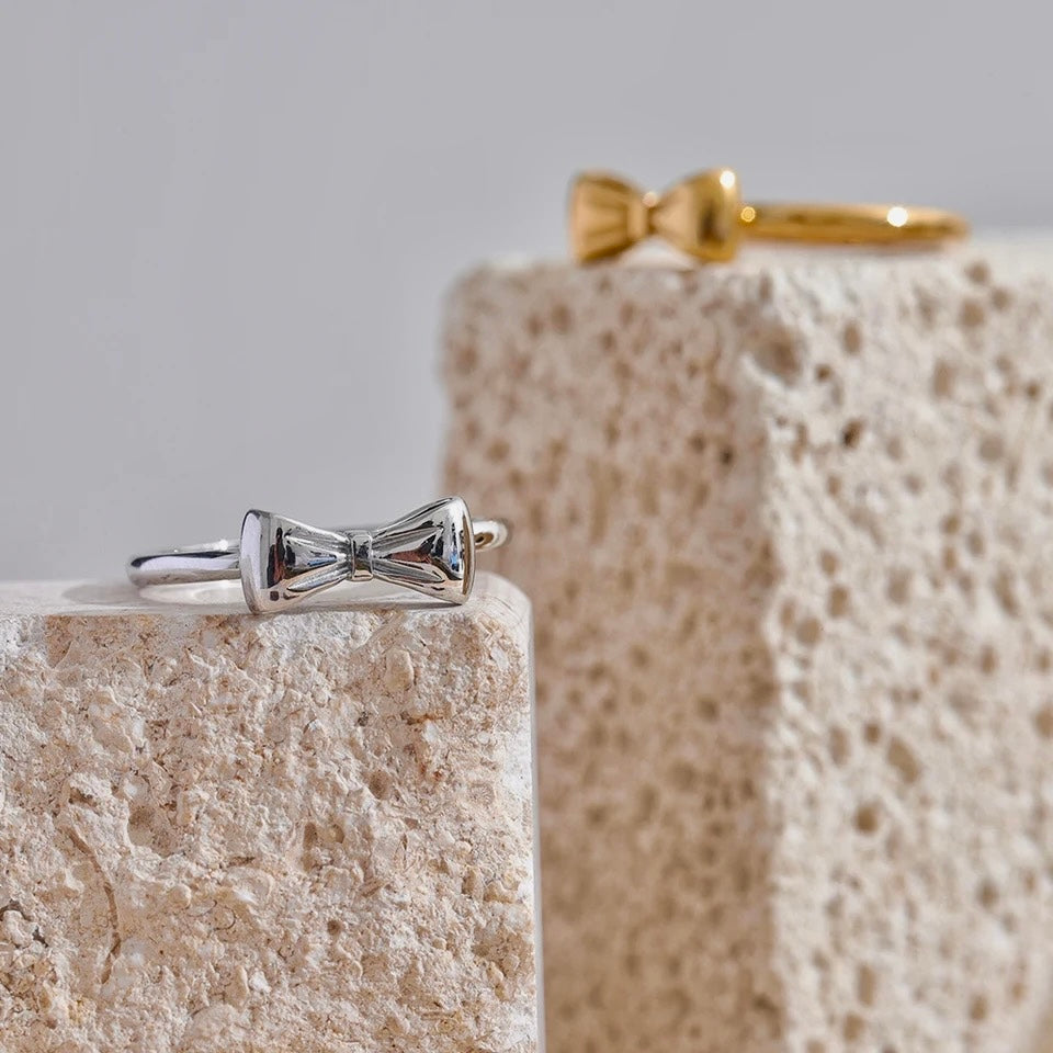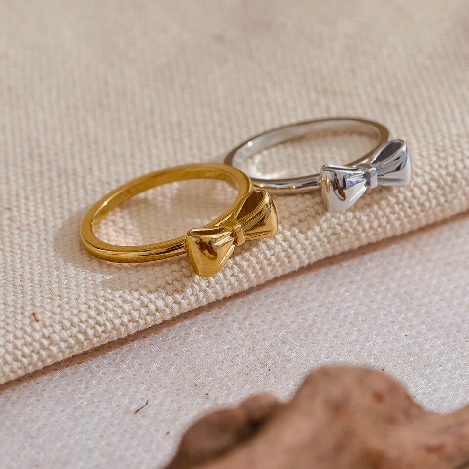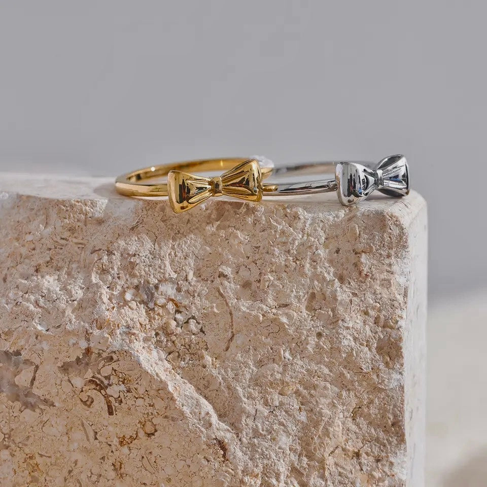Dress up your fingers with our Gold Bow ring! Made of 18k gold plated stainless steel, this ring features an adorable bow design. Available in gold and silver, it's waterproof, tarnish free, and hypoallergenic. Perfect for adding a touch of whimsy to any outfit!