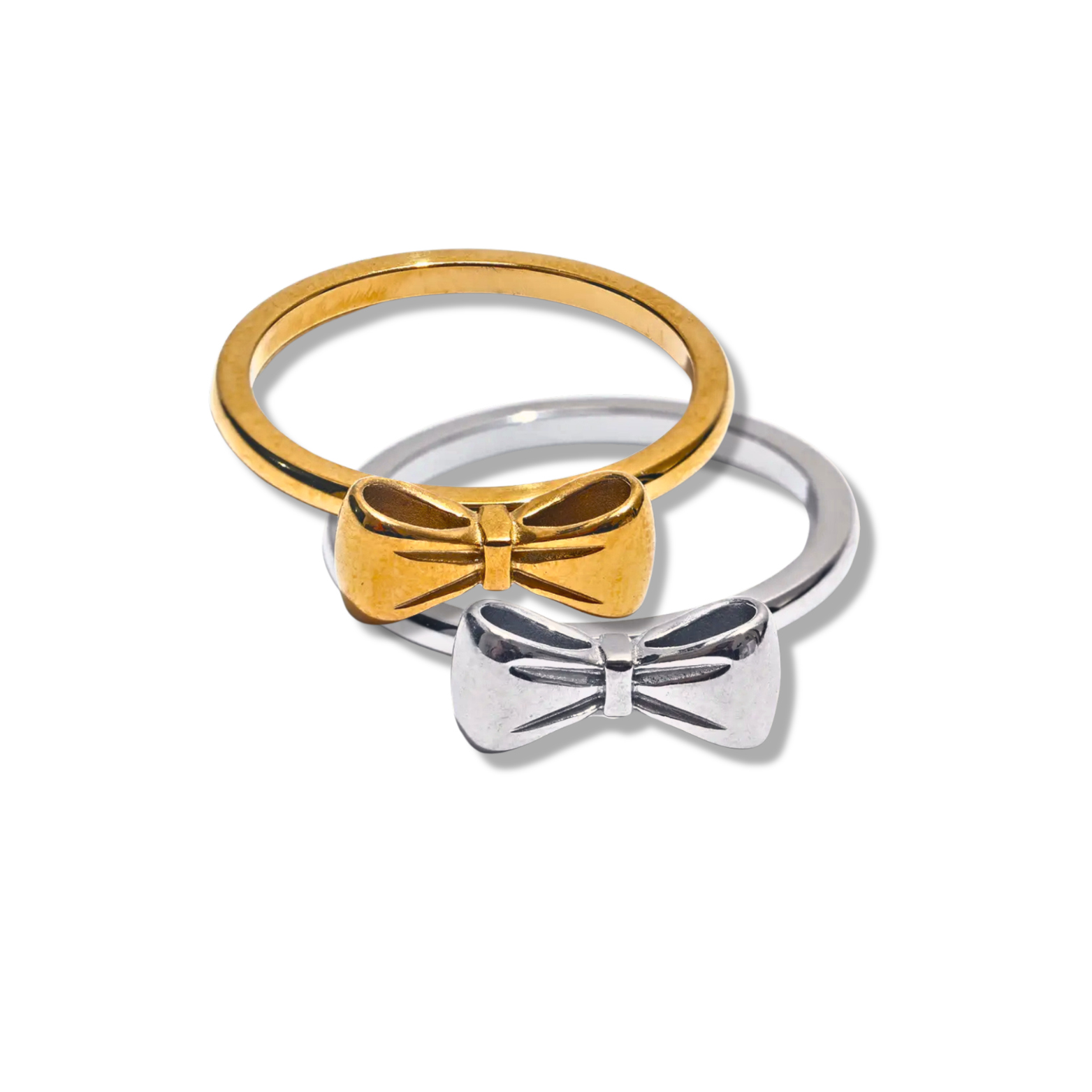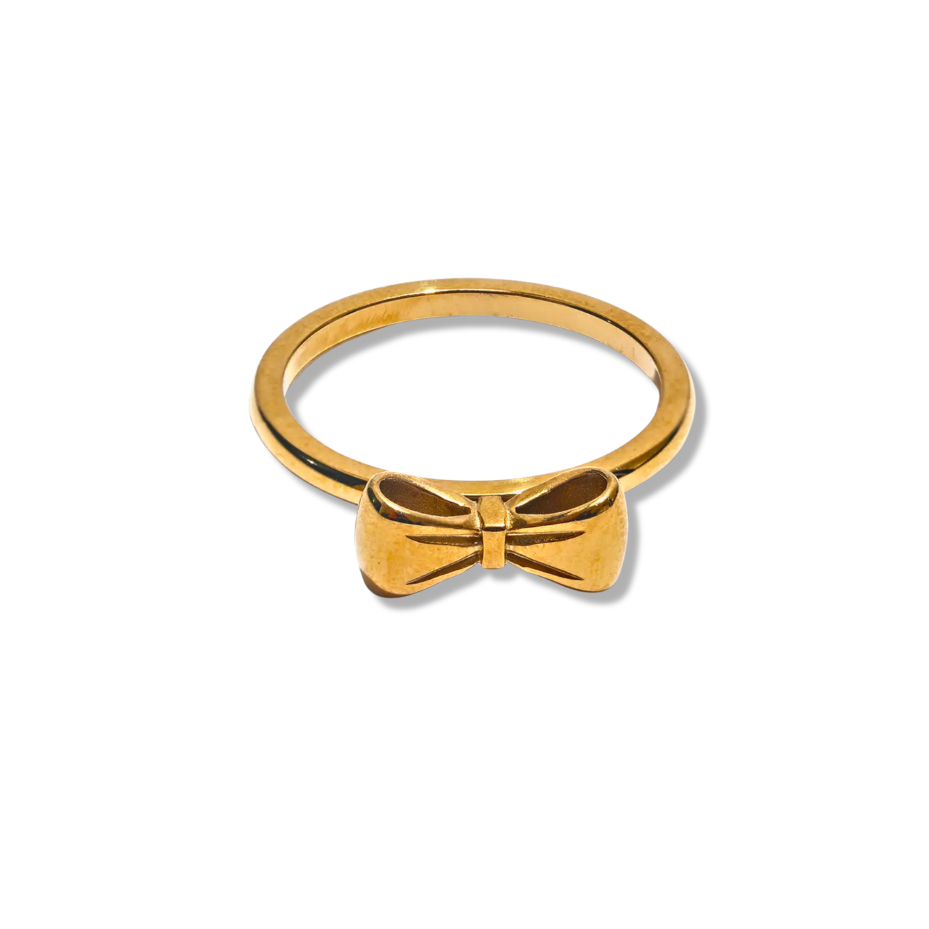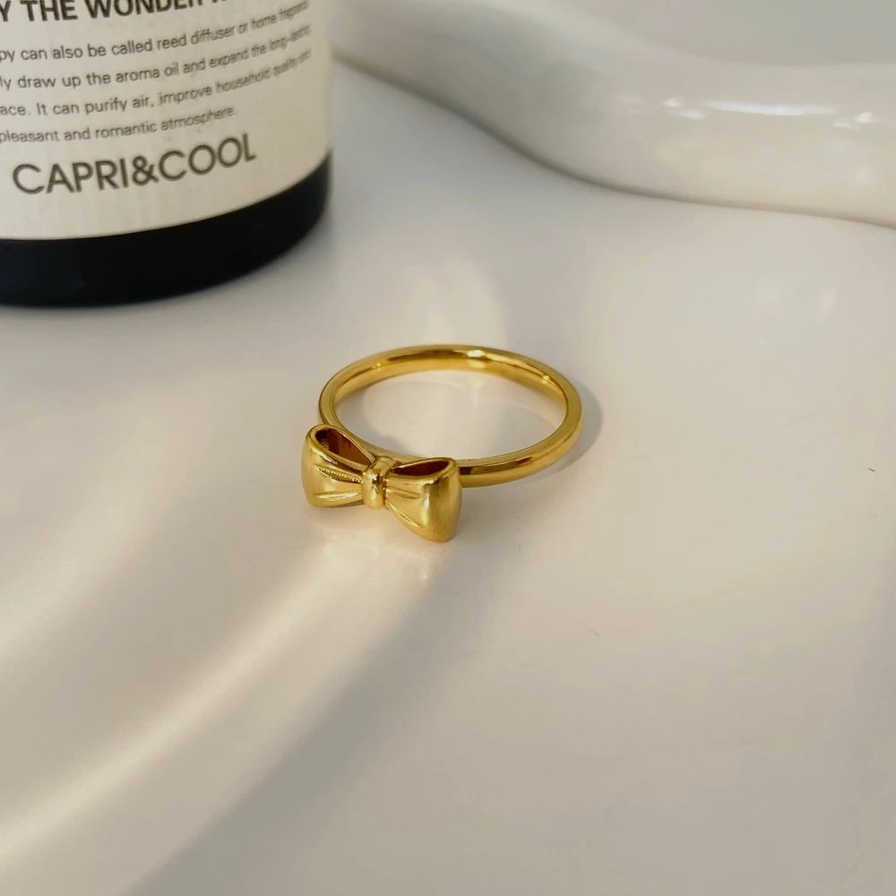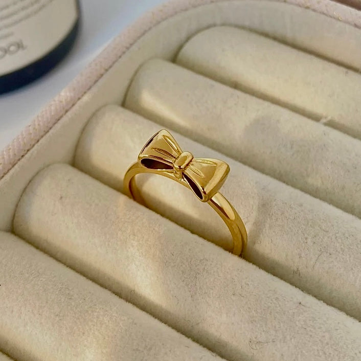 Dress up your fingers with our Gold Bow ring! Made of 18k gold plated stainless steel, this ring features an adorable bow design. Available in gold and silver, it's waterproof, tarnish free, and hypoallergenic. Perfect for adding a touch of whimsy to any outfit!