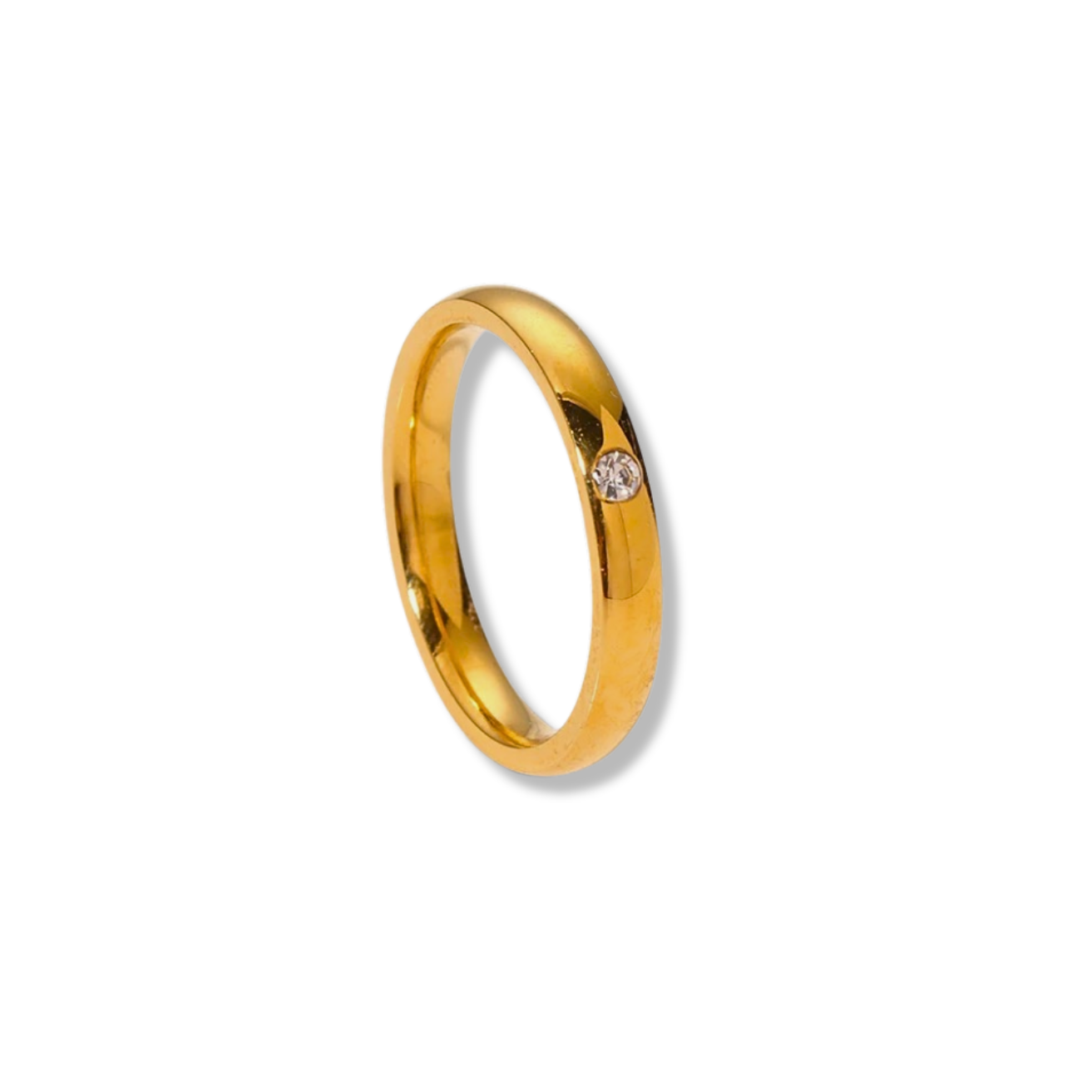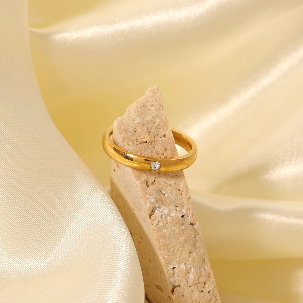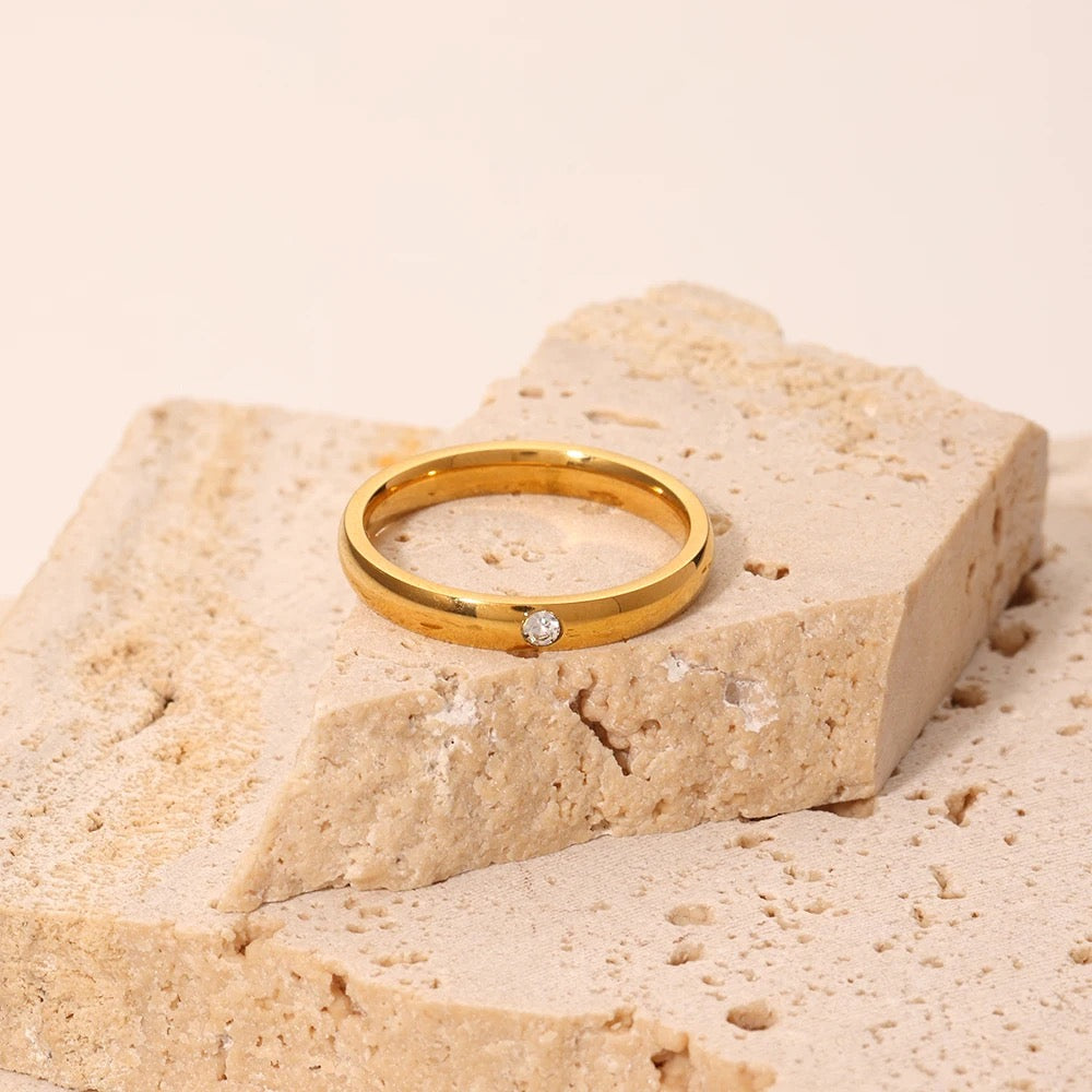 Introducing the Dawn ring, a 18k gold plated stainless steel ring with a thick gold band and a sparkling cubic zirconia stone. Stay stylish without worrying about tarnish or allergies, this ring is waterproof and hypoallergenic. Shine on with Dawn!