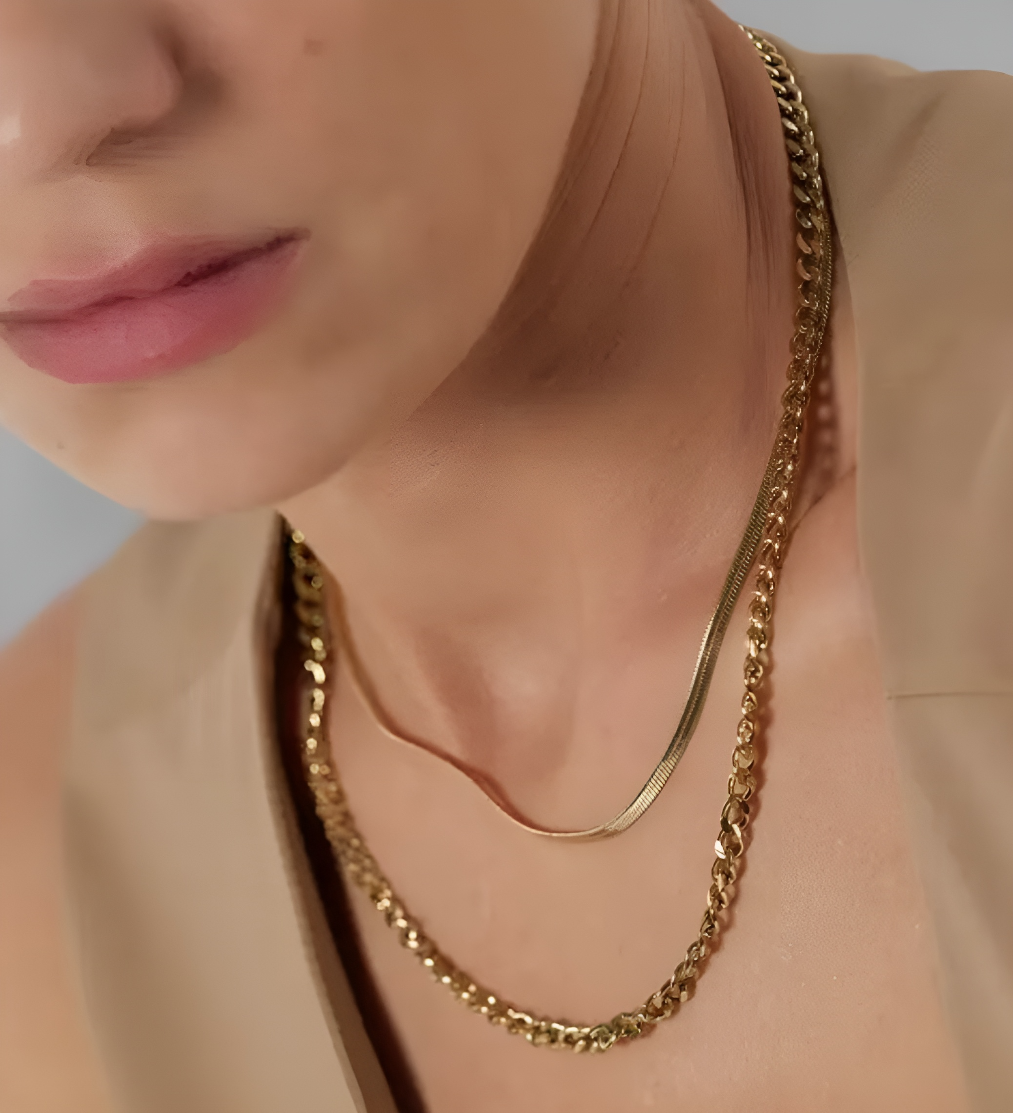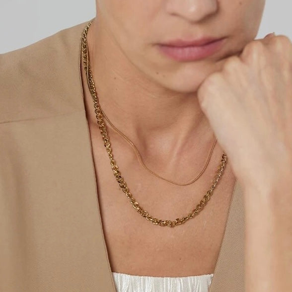 Introducing our Everly Layered Necklace - a stylish and versatile piece that effortlessly combines modern design with timeless elegance. This layered necklace features a thick Cuban chain paired with a shorter snake chain, creating a chic and eye-catching look.