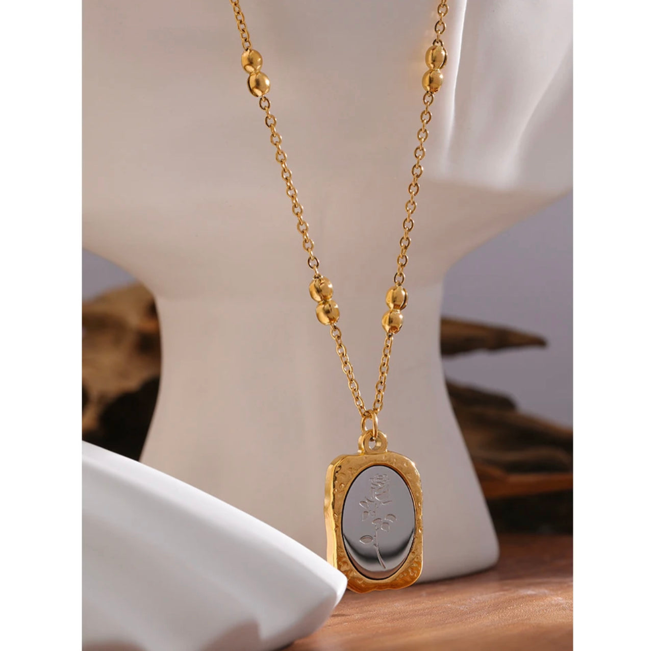 Introducing our Elaria Necklace - a stunning piece that seamlessly combines grace and resilience. This necklace features a delicate beaded chain that adds a touch of sophistication to your neckline, and a pendant with an intricate rose design, symbolising beauty and love.
