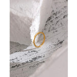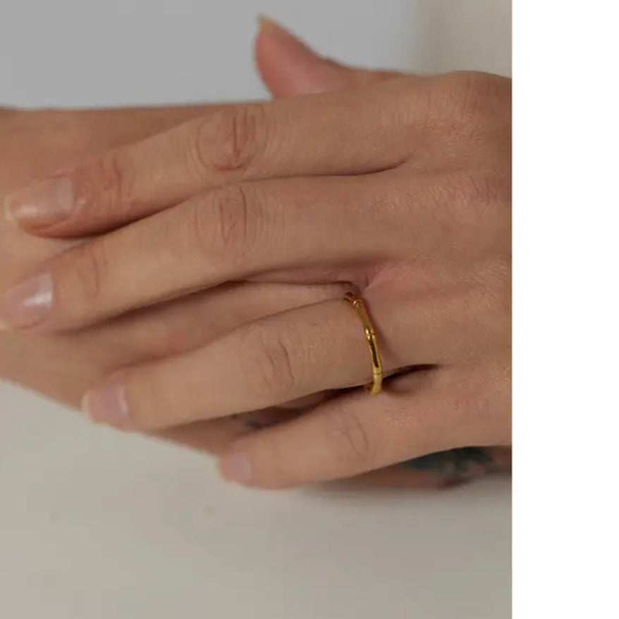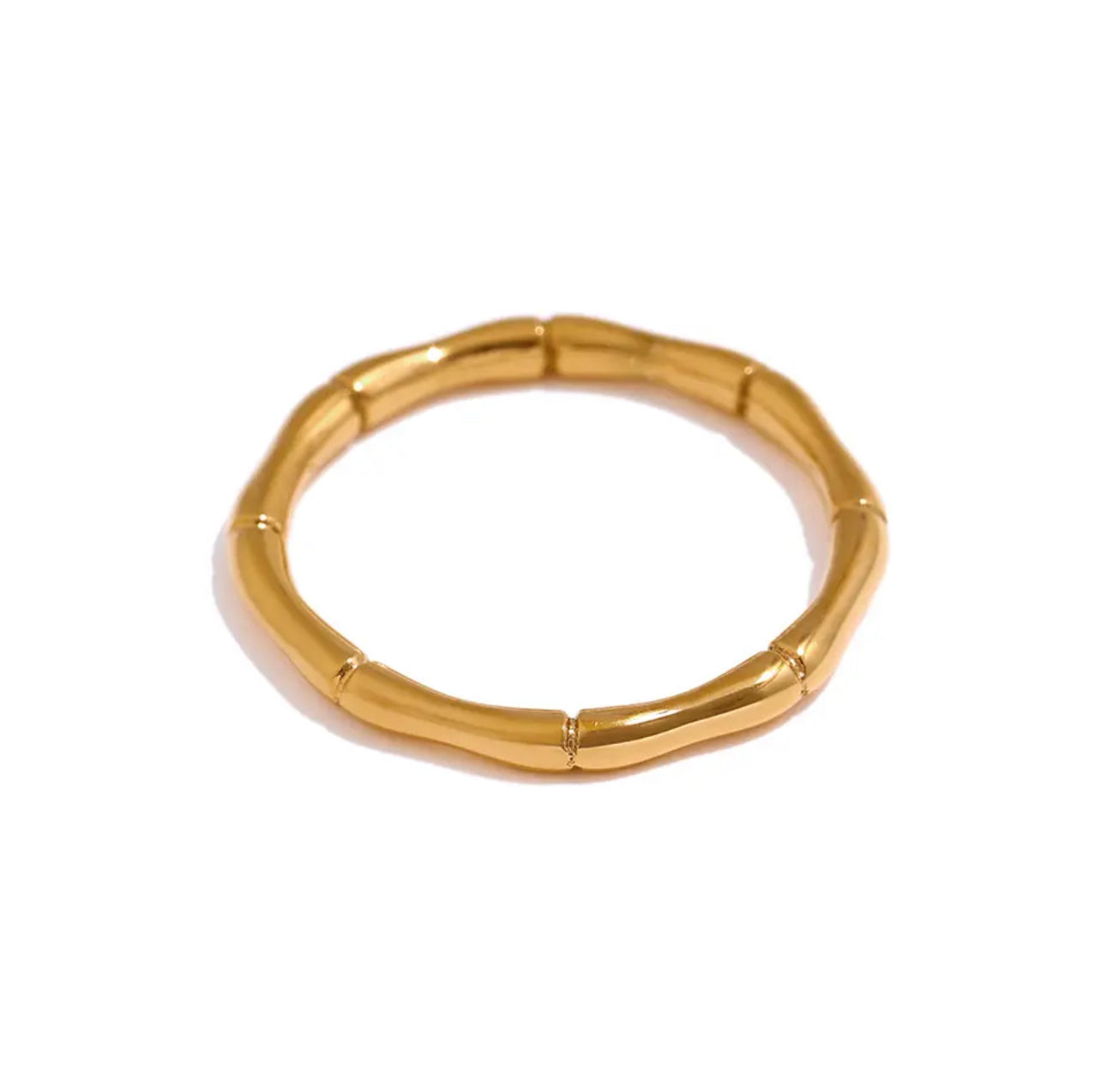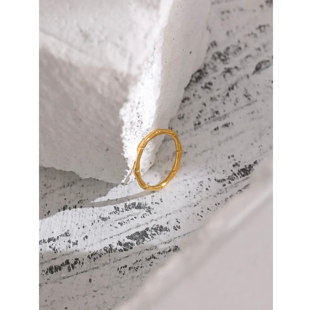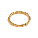 Introducing our Malibu Bamboo Band - a sleek and versatile addition to your jewellery collection. This thin, gold band features an intricate bamboo design, exuding a touch of nature-inspired charm. Crafted for both style and practicality, it's not only waterproof but also sweatproof, ensuring that it retains its beauty and shine even in active, everyday situations.
