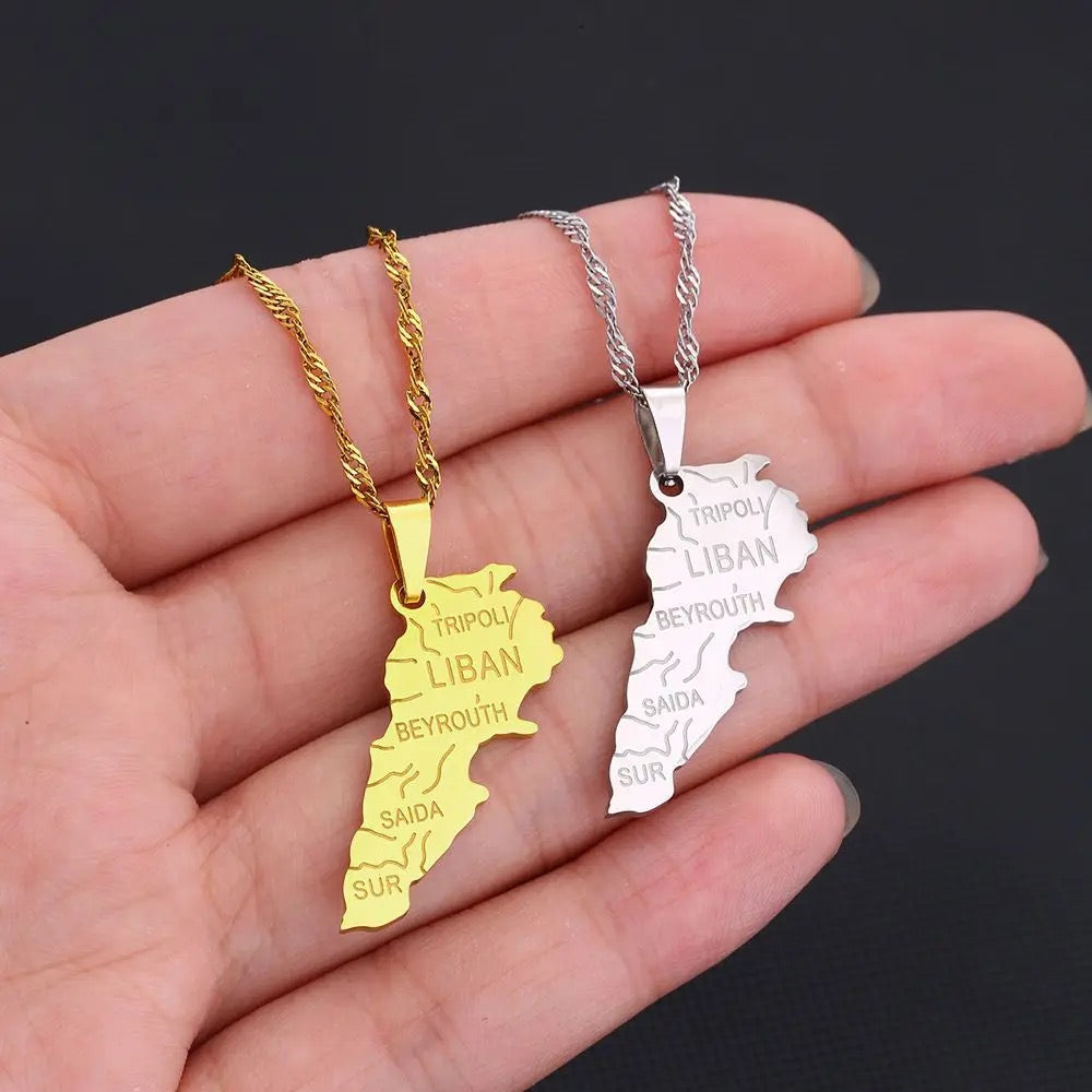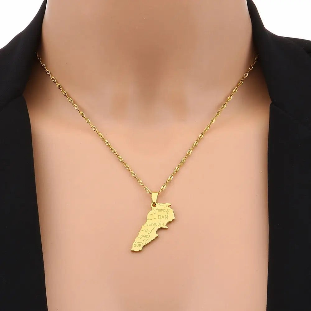 Show off your love for Lebanon with our 18K PVD gold plated necklace! Made of stainless steel, it's waterproof, tarnish free, and hypoallergenic. The thin chain and intricate map pendant make it a perfect accessory for any outfit. Show your pride and style with this stunning necklace.