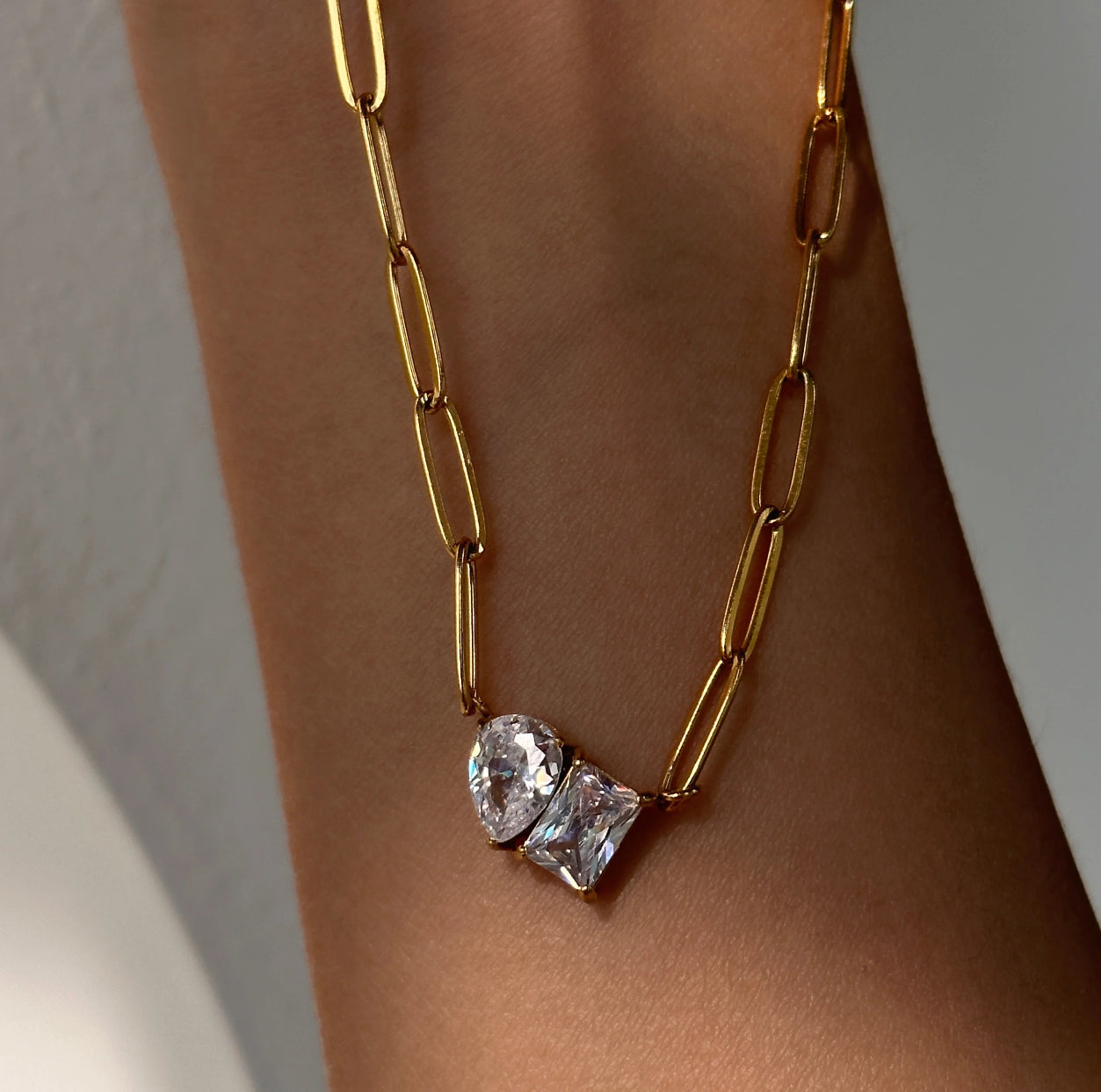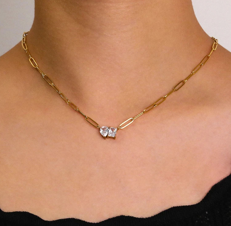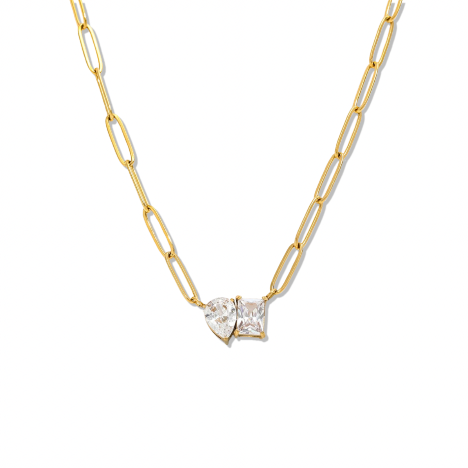 Teardrop and rectangular CZ stones on a paperclip chain.