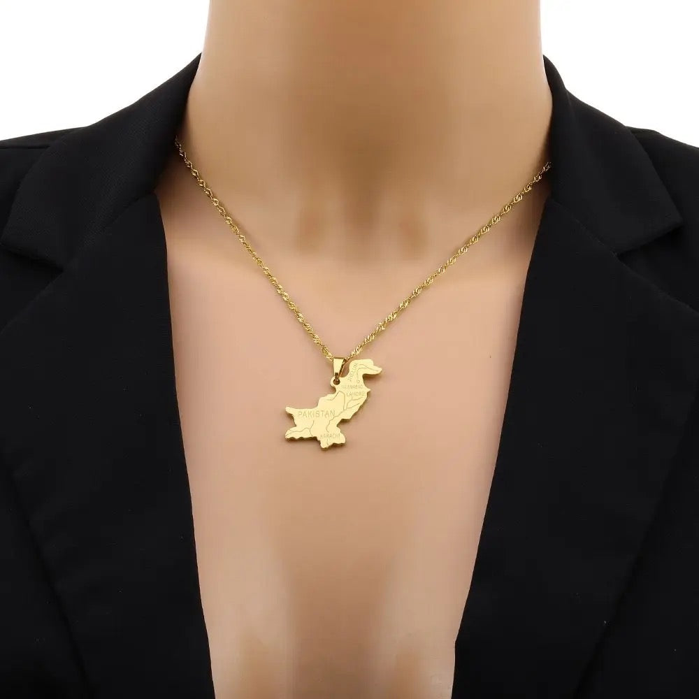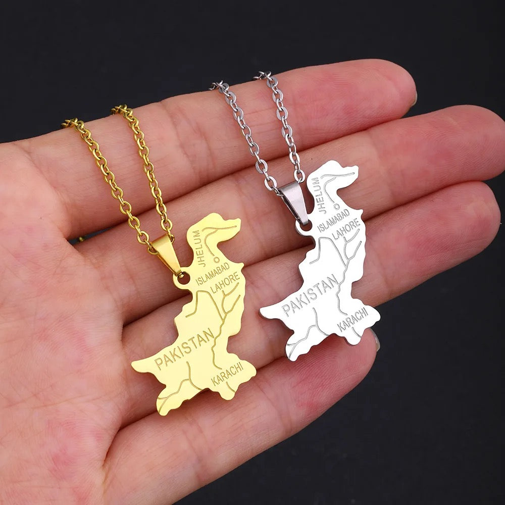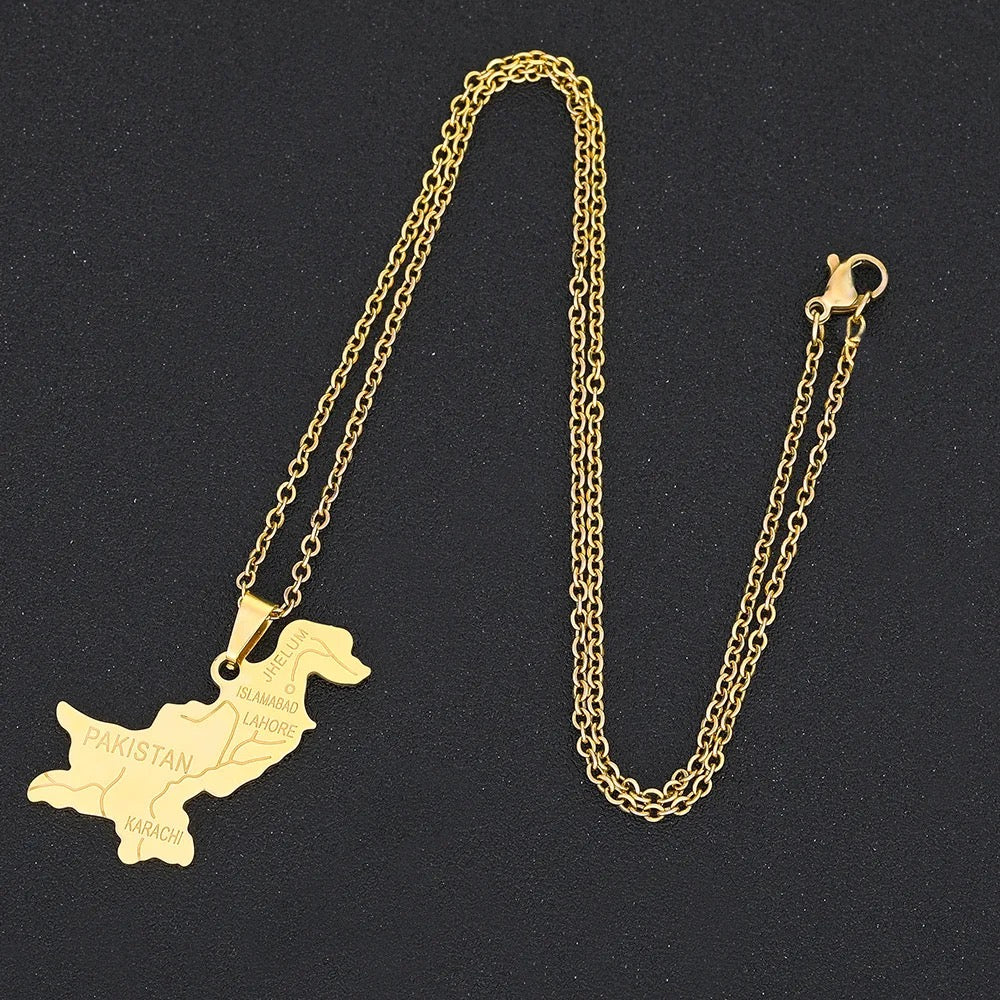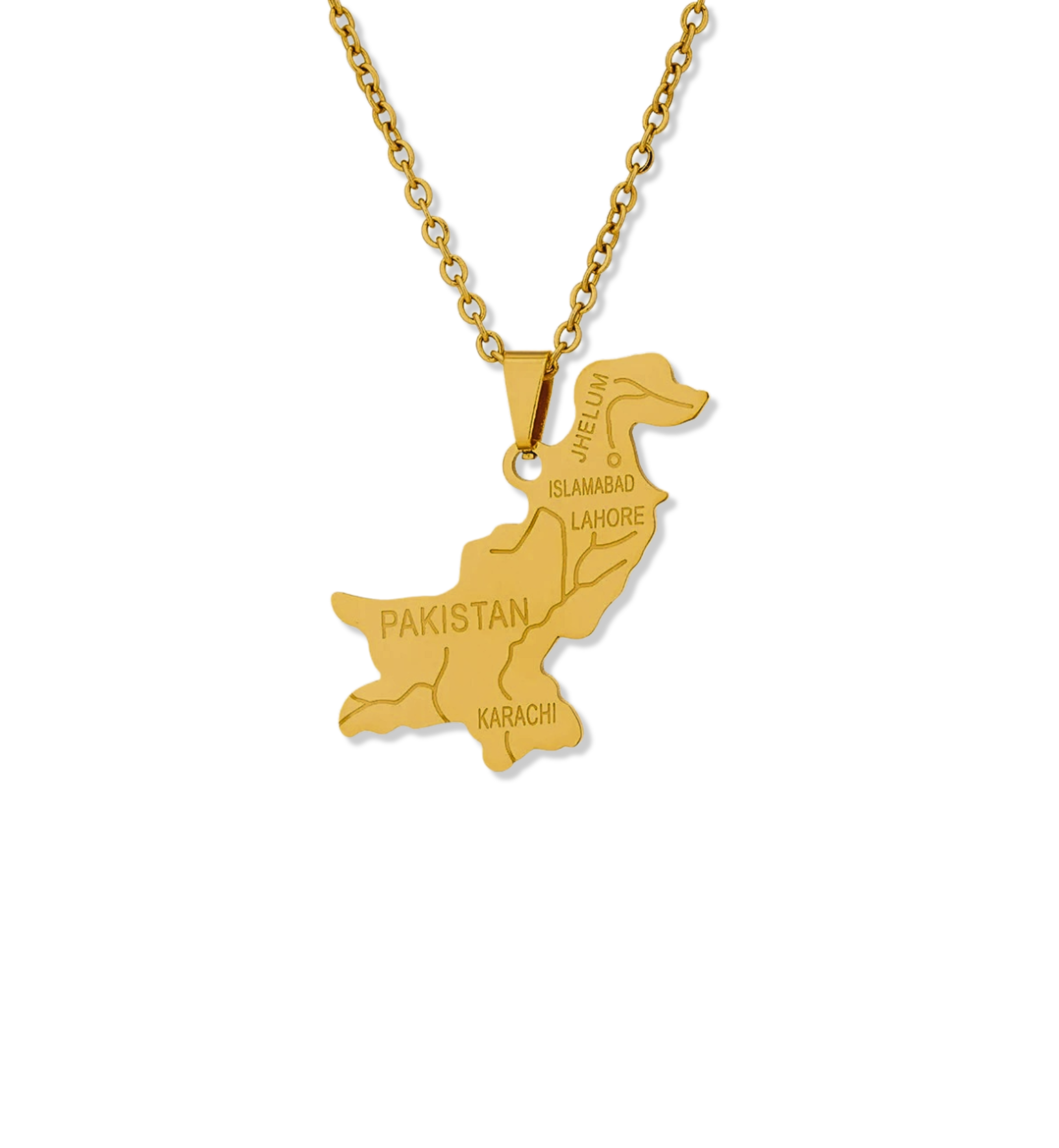 Show off your love for Pakistan with our 18K PVD gold plated necklace! Made of stainless steel, it's waterproof, tarnish free, and hypoallergenic. The thin chain and intricate map pendant make it a perfect accessory for any outfit. Show your pride and style with this stunning necklace.