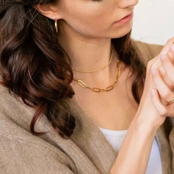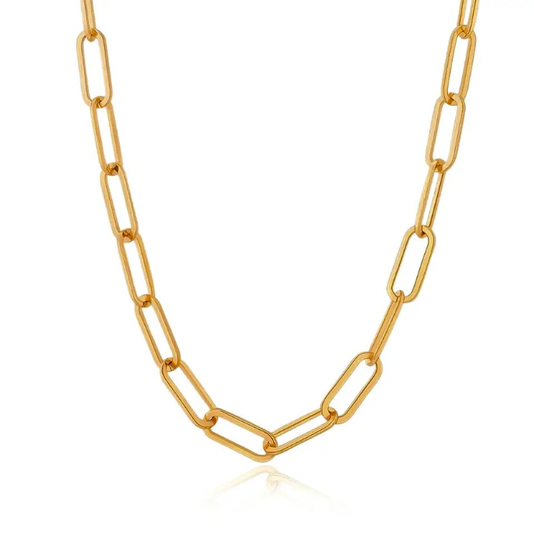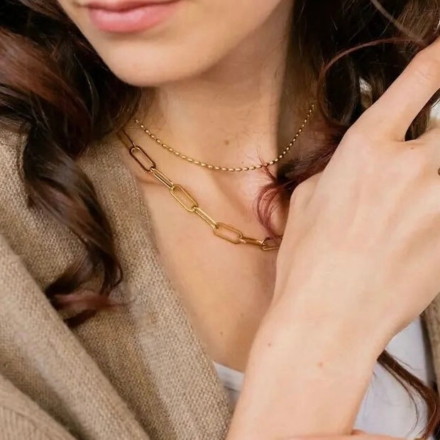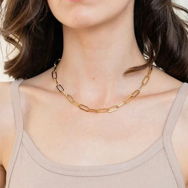 This lightweight, 18k gold plated paper clip chain is perfect for layering. Its stainless steel material ensures that it is waterproof and tarnish-free, making it a durable and hypoallergenic option for everyday wear. Add a touch of elegance and versatility to any outfit with this chain.