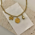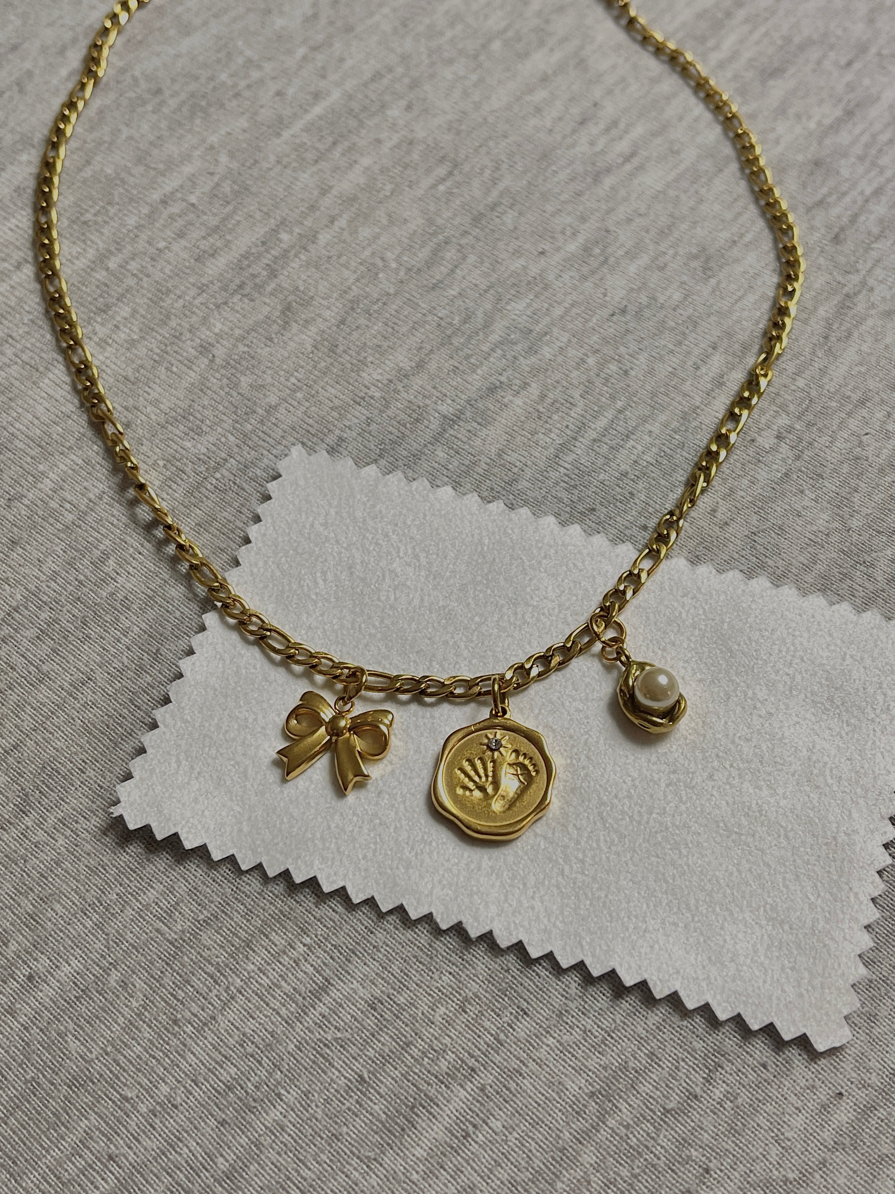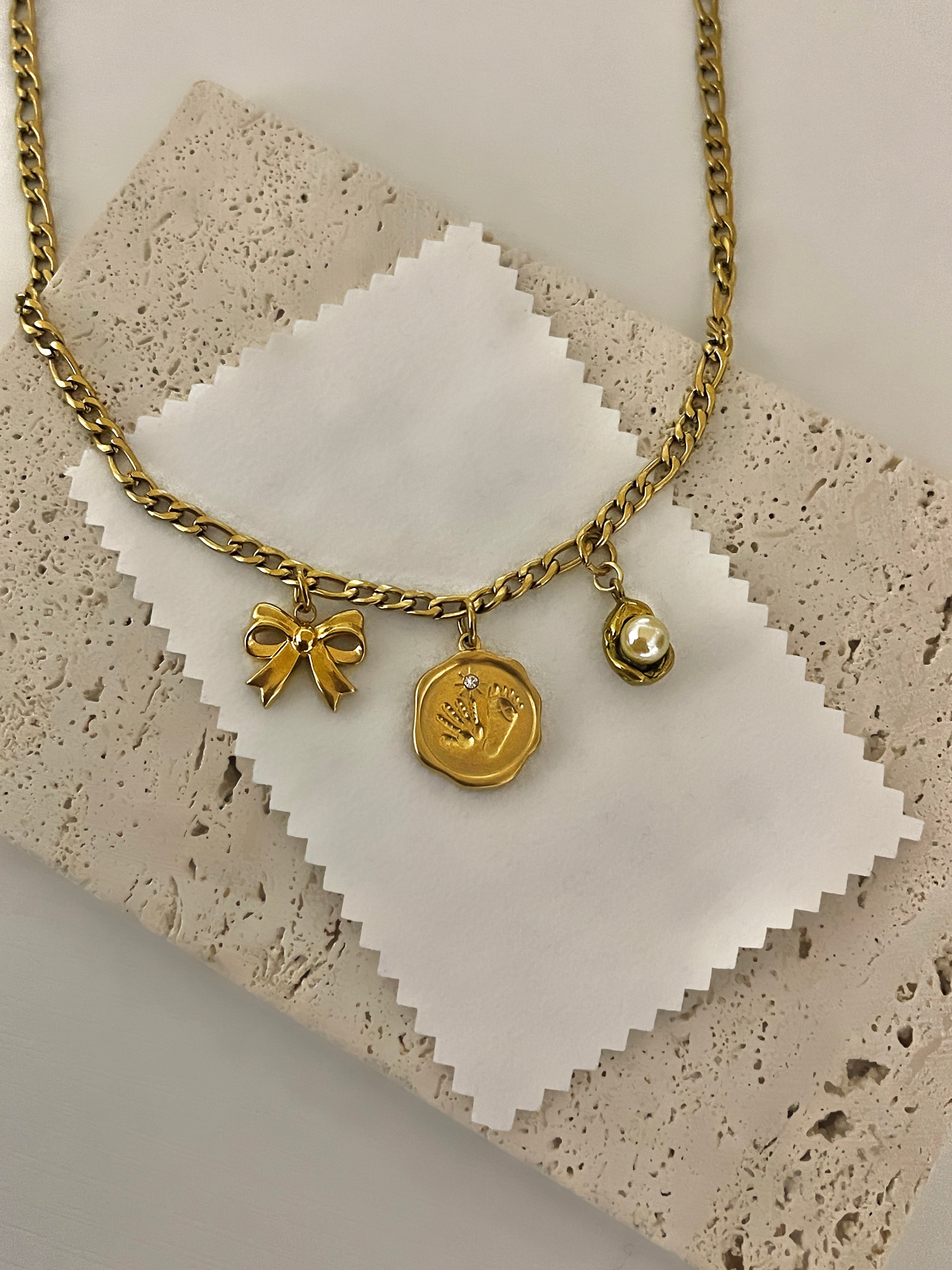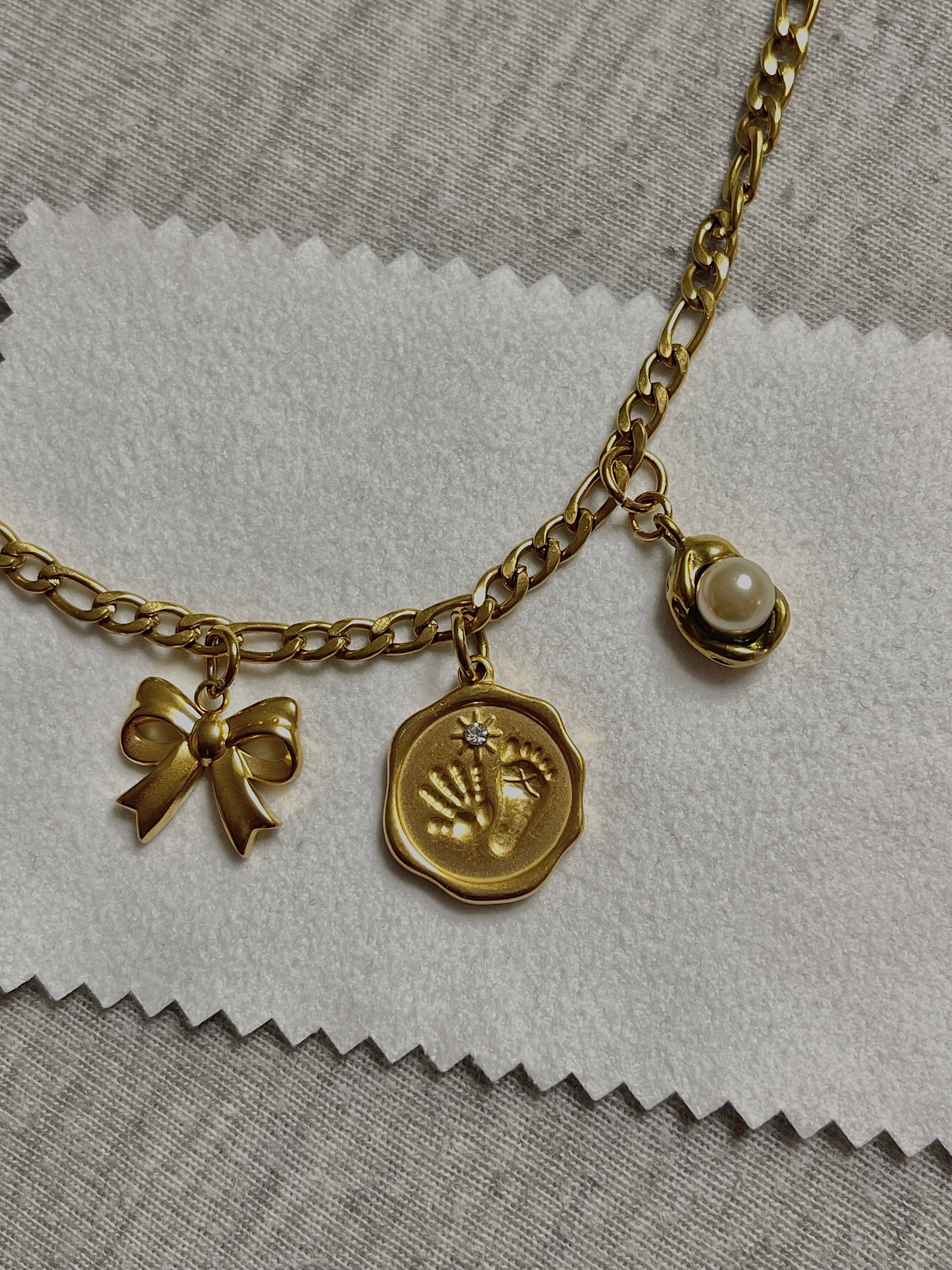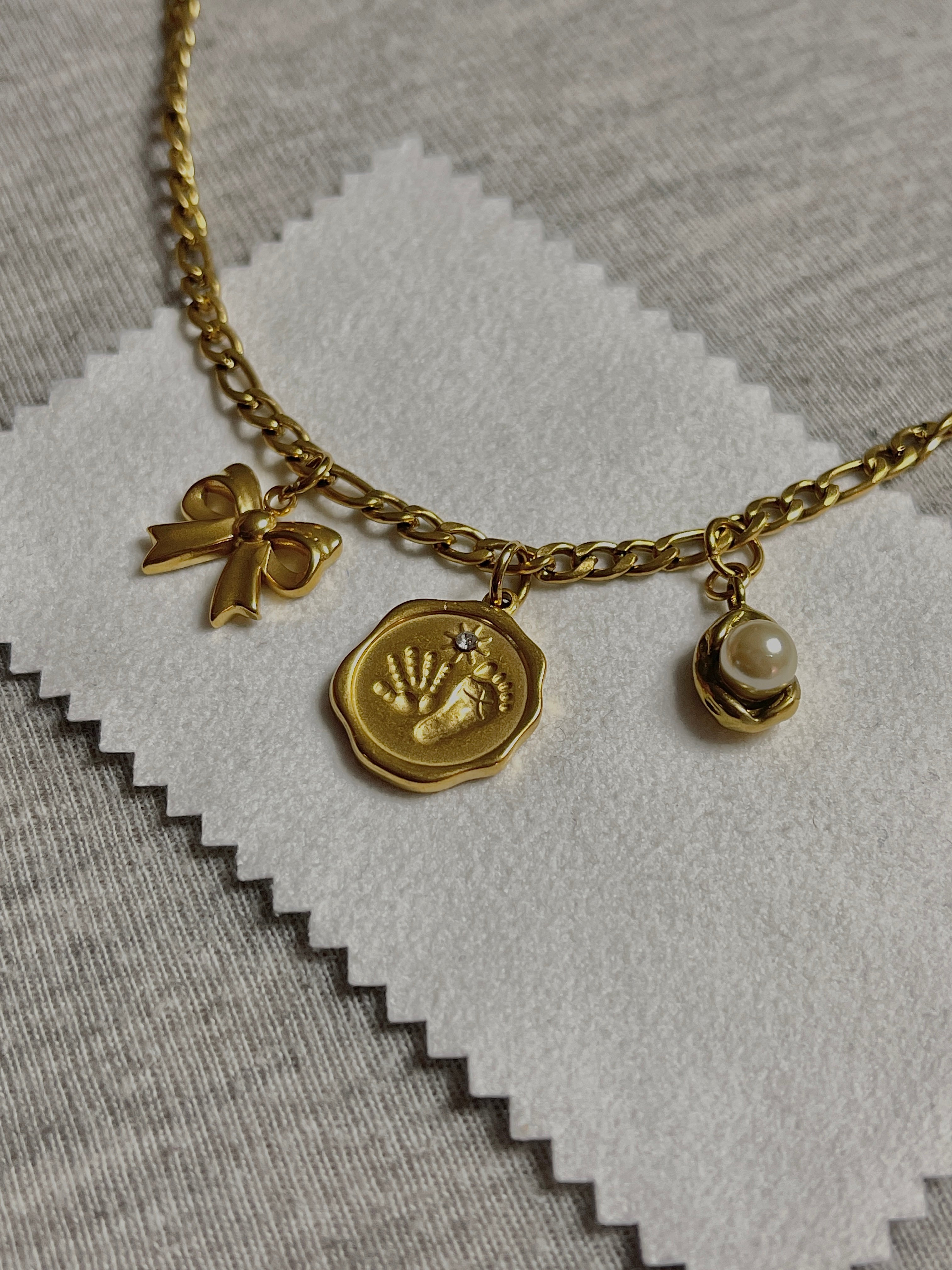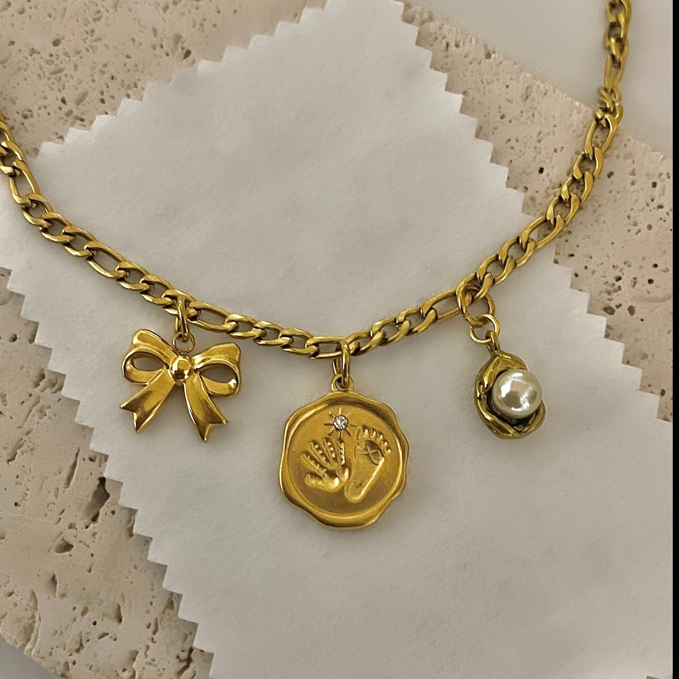 The Rabecca necklace is a must-have for every mom or mom-to-be! Crafted with love, this handmade charm necklace features a figaro chain adorned with a 'baby mamma' charm, bow charm, and pearl charm. Made with 18k PVD plated stainless steel, it is waterproof, tarnish-free, and hypoallergenic. Treat yourself or surprise a mom-to-be with this beautiful and meaningful accessory.