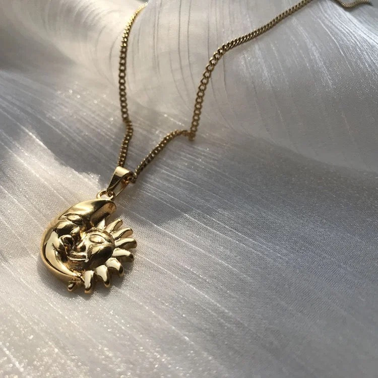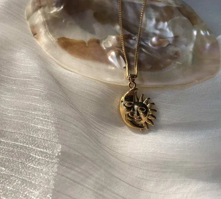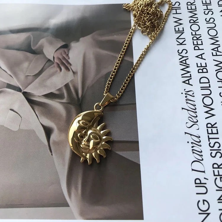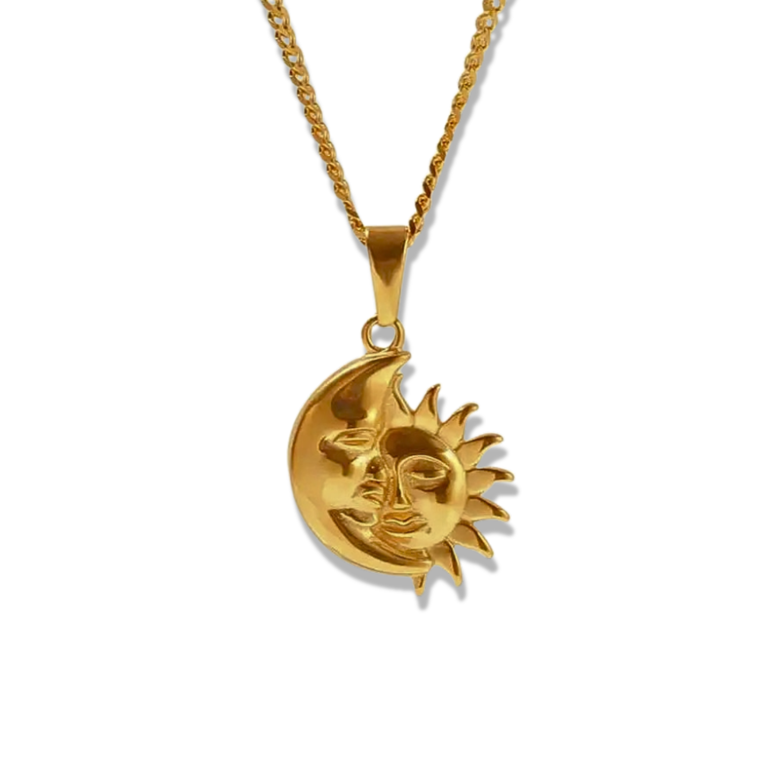 Embrace celestial vibes with our Tallula necklace. Made from 18k PVD plated stainless steel, its half moon and sun pendant hangs delicately on a thin Cuban chain. Waterproof, tarnish-free, and hypoallergenic, this necklace is a stylish and low-maintenance addition to your jewelry collection.