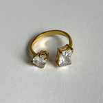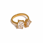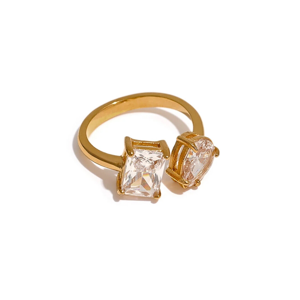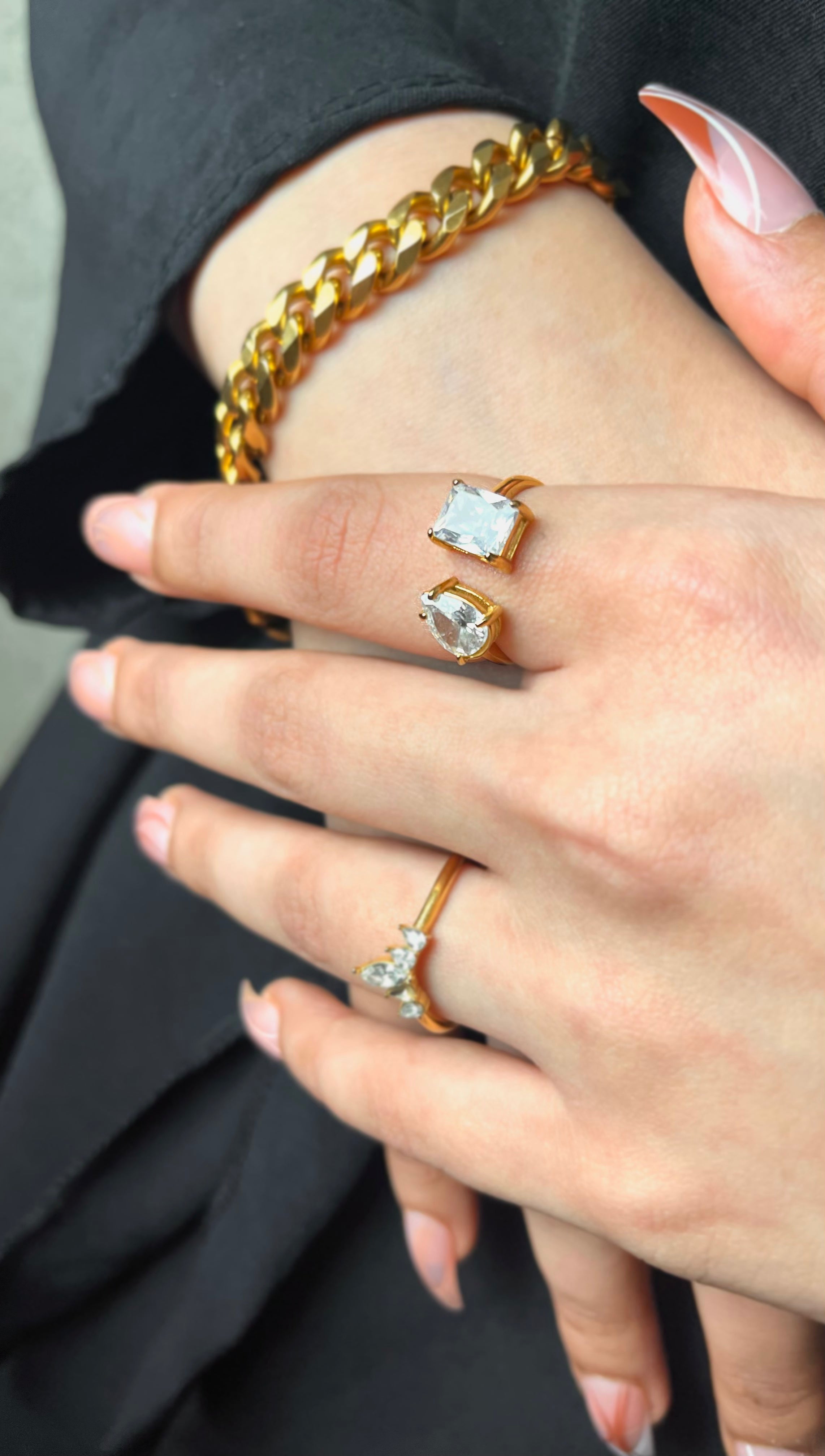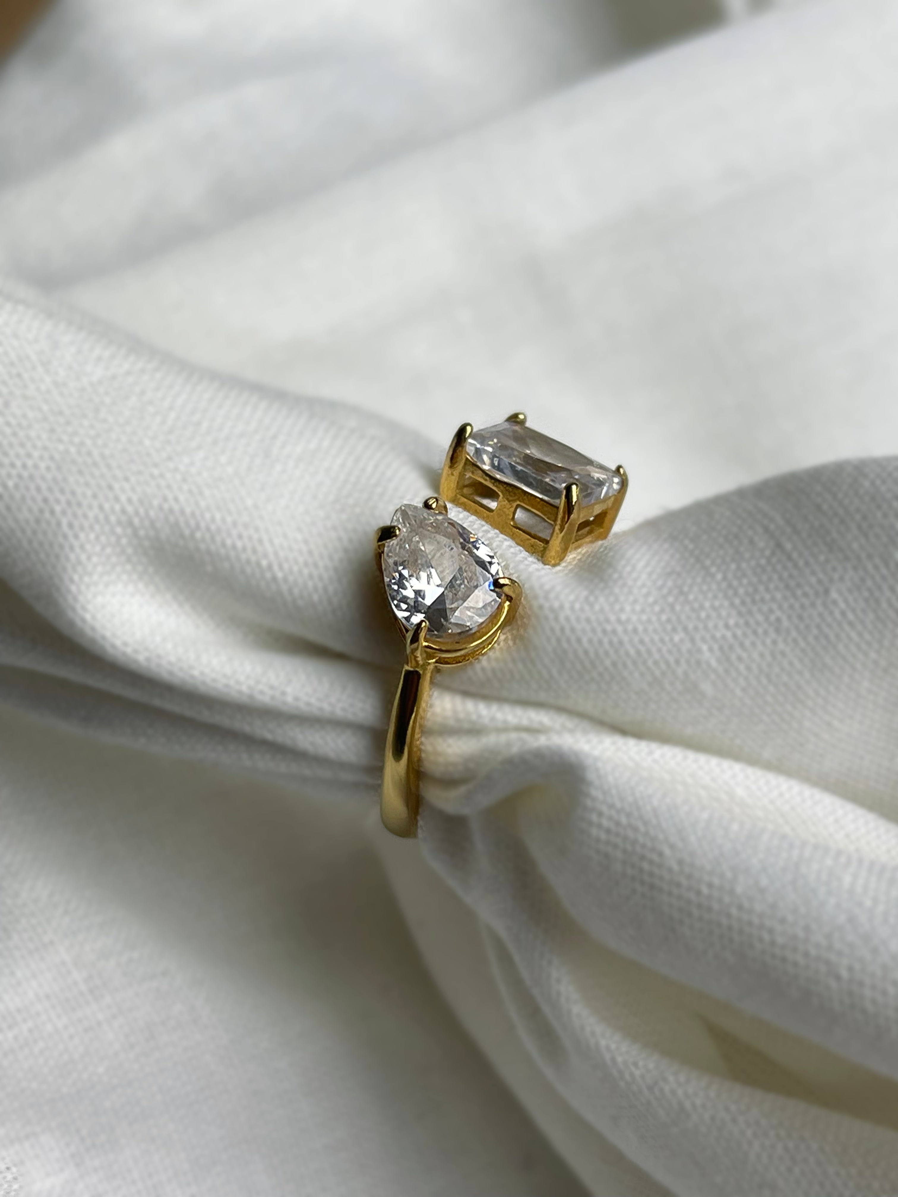 This stunning ring is PVD gold plated making it waterproof and tarnish-free, ensuring that it retains its shine and quality for years to come. The teardrop and rectangular stone are carefully selected for their beauty and brilliance, adding a touch of elegance to any outfit. The adjustable design ensures a perfect fit for any finger size, providing comfort and security throughout the day. Whether you're dressing up for a special occasion or looking to add some sparkle to your everyday look, this ring is the perfect choice. Make a statement with this elegant piece of Jewellery that will have heads turning wherever you go!