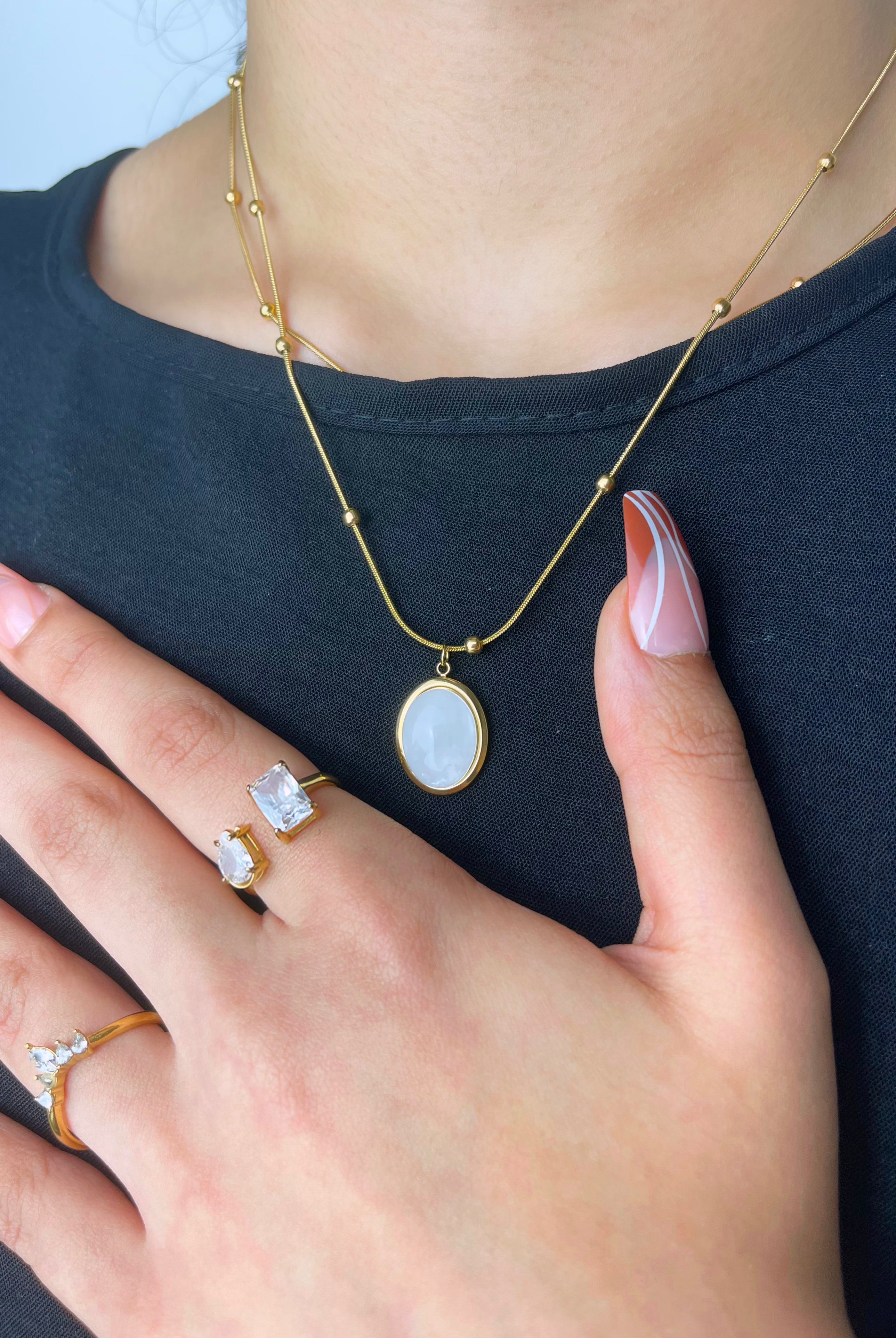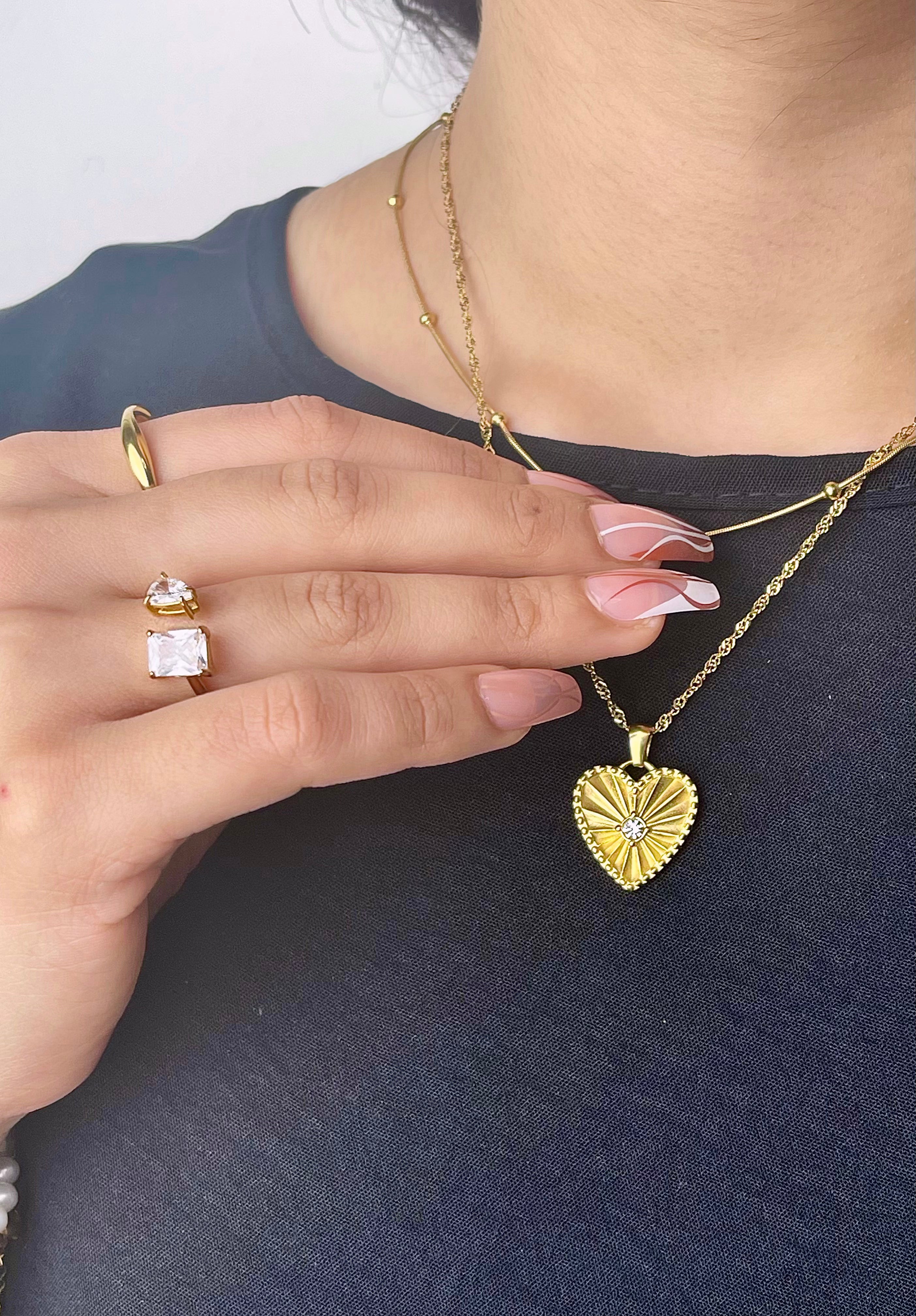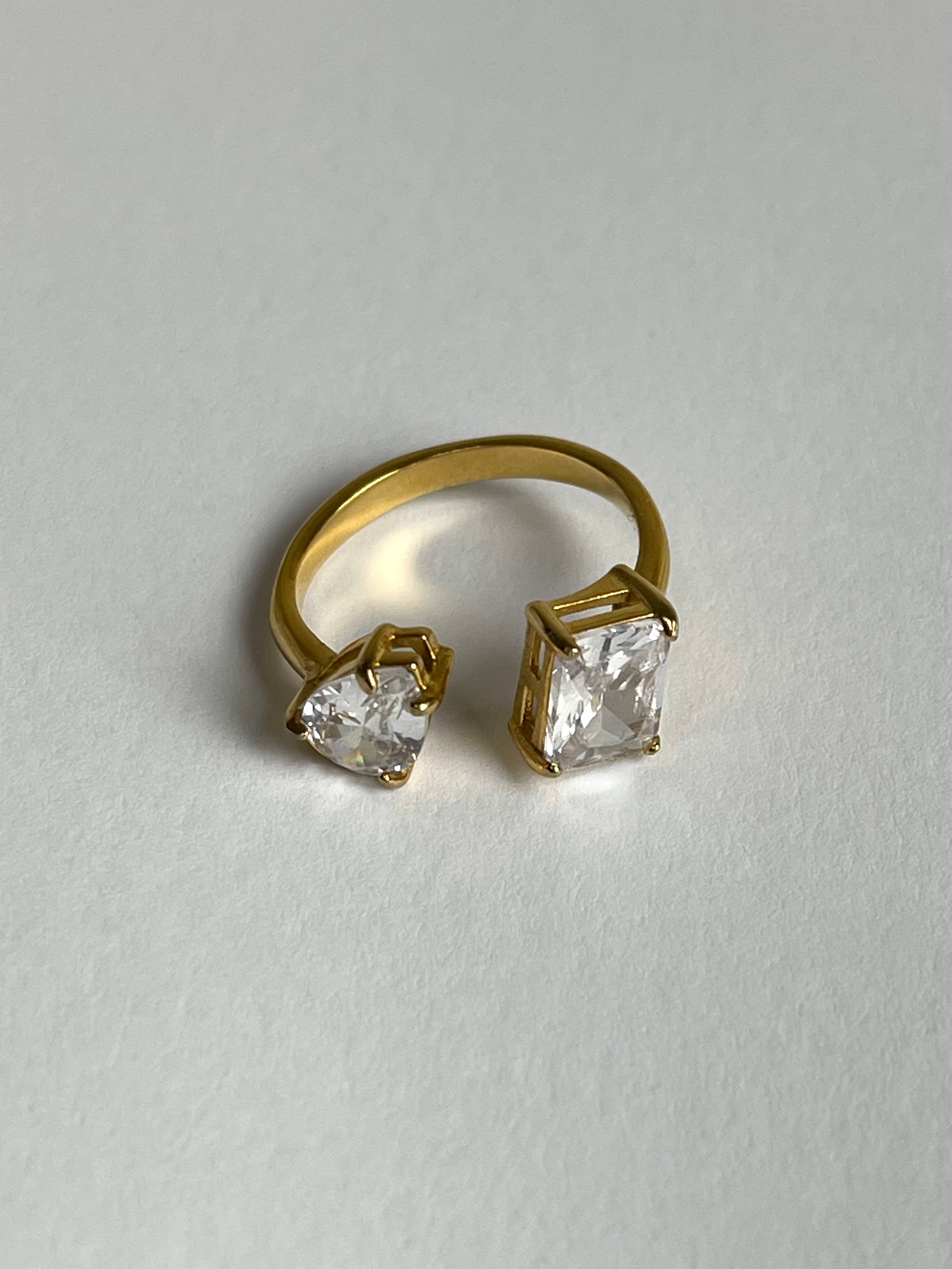 This stunning ring is PVD gold plated making it waterproof and tarnish-free, ensuring that it retains its shine and quality for years to come. The teardrop and rectangular stone are carefully selected for their beauty and brilliance, adding a touch of elegance to any outfit. The adjustable design ensures a perfect fit for any finger size, providing comfort and security throughout the day. Whether you're dressing up for a special occasion or looking to add some sparkle to your everyday look, this ring is the perfect choice. Make a statement with this elegant piece of Jewellery that will have heads turning wherever you go!