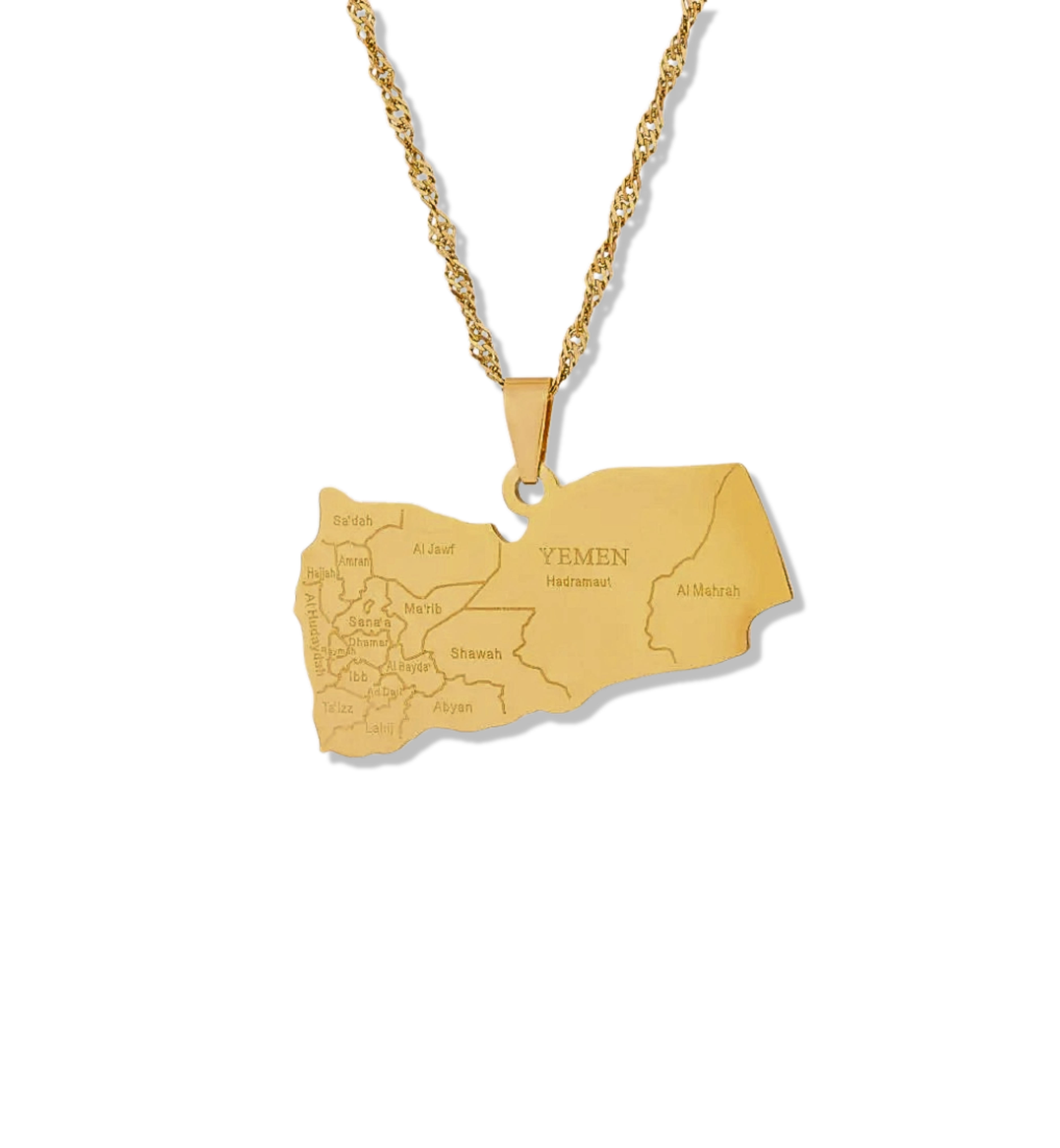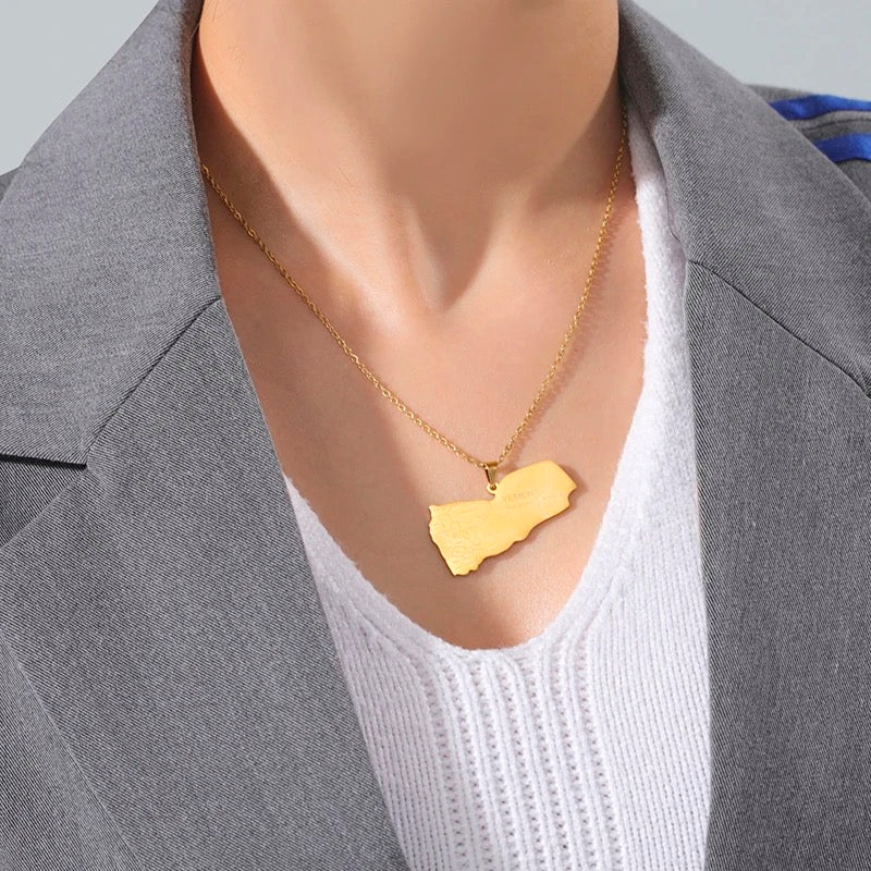 Show off your love for Yemen with our 18K PVD gold plated necklace! Made of stainless steel, it's waterproof, tarnish free, and hypoallergenic. The thin chain and intricate map pendant make it a perfect accessory for any outfit. Show your pride and style with this stunning necklace.